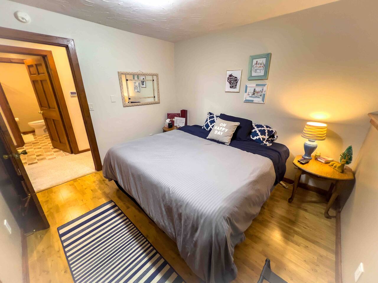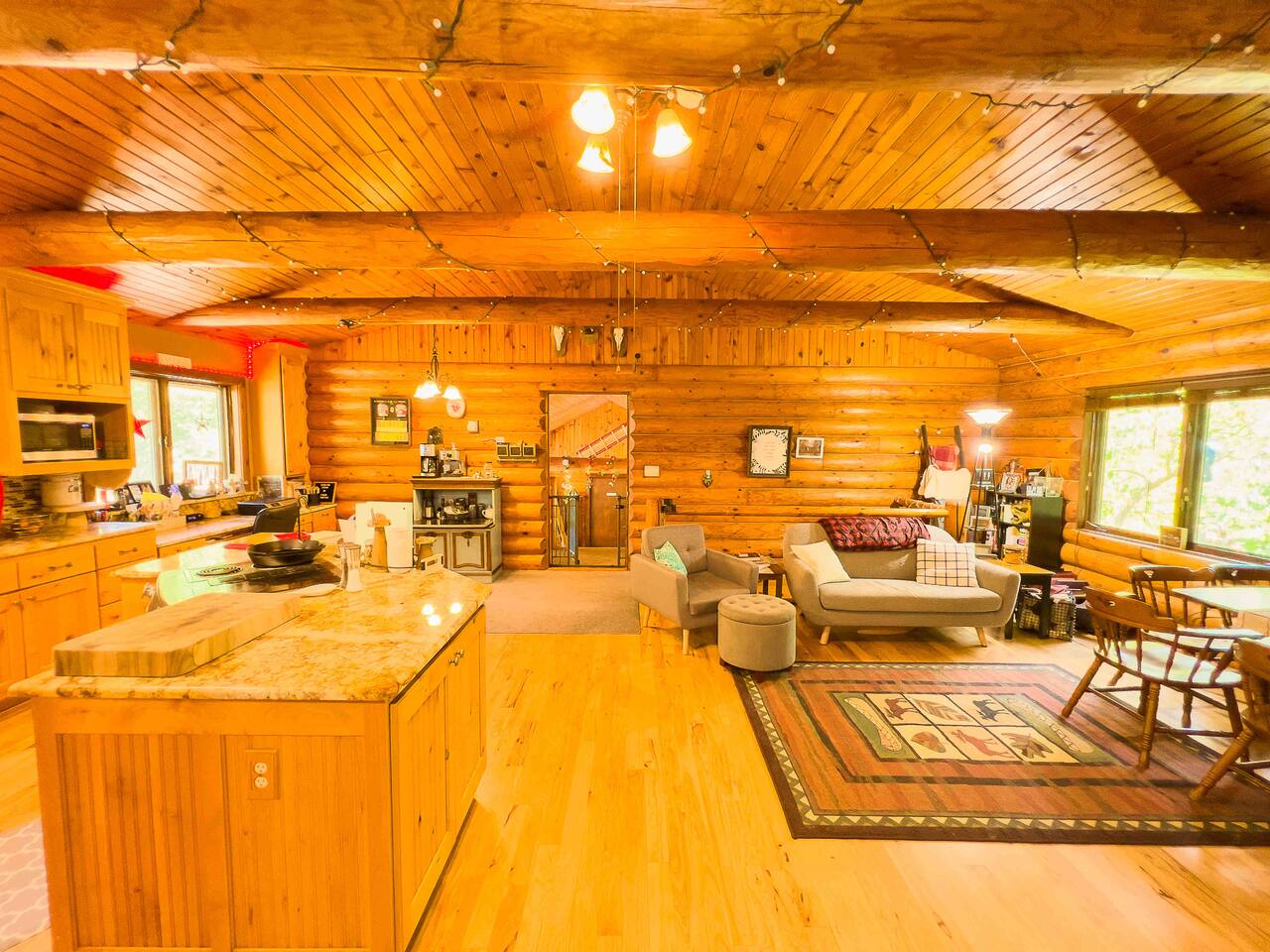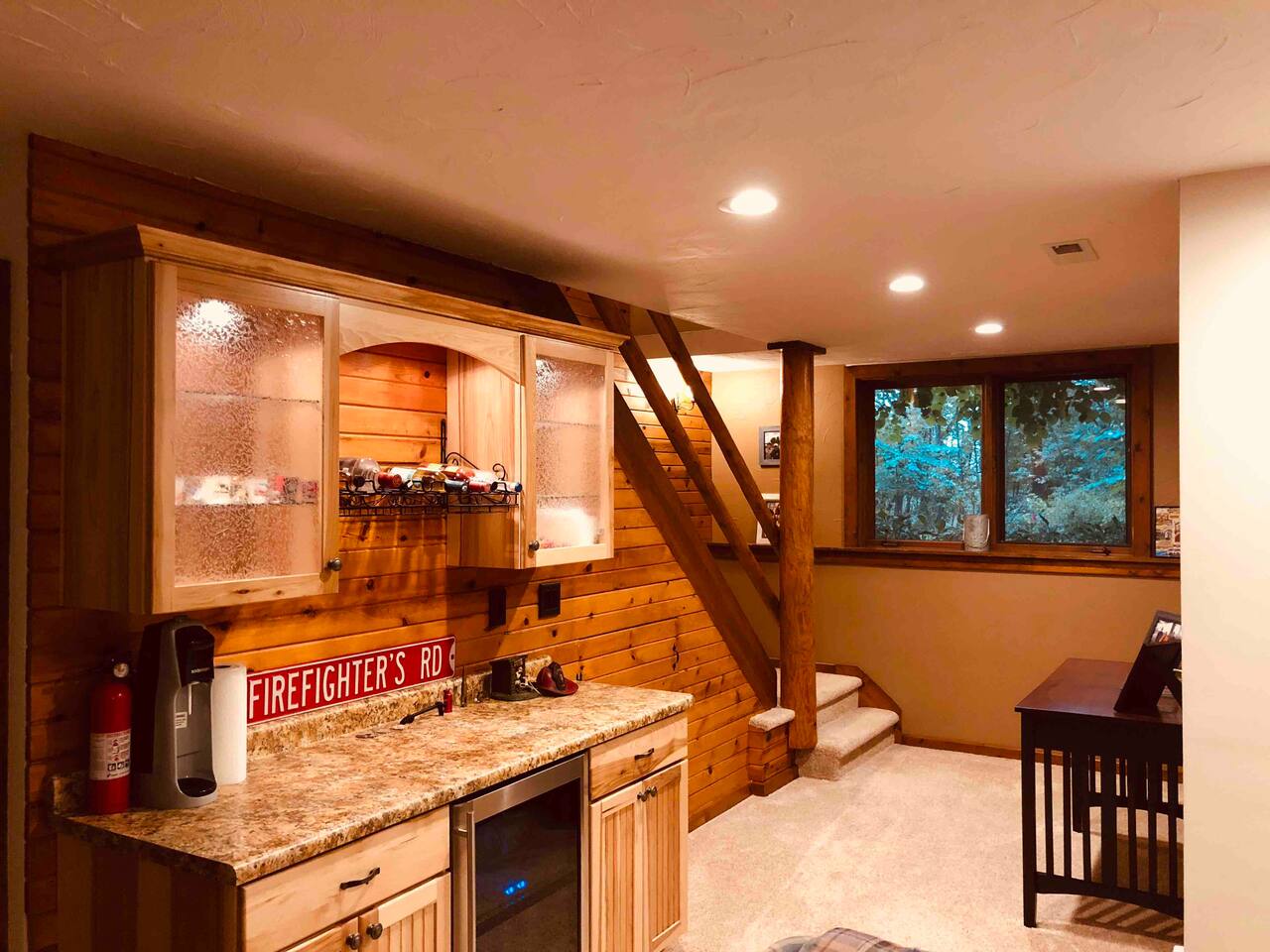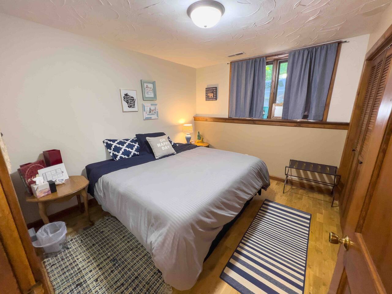 The beautiful kitchen is fully equipped with everything needed to cook for a party of 6 or a small romantic meal. For your convenience, some basic ingredients and spices are provided. Cozy up to the cobblestone fireplace indoors or keep warm at the fireplace outdoors on the picturesque deck complete with patio furniture, grill & outdoor lighting. The deck is the perfect place to spend the day relaxing, visiting, or simply enjoying the brilliance of Southeast Wiscsonsin's starry sky. Wildlife sightings from the deck regularly include deer, turkey, fox, chipmunks, squirrels, and dozens of species of birds. If lake life is what you’re interested in, the home is located a short drive from Pewaukee Lake. Fishing, boating, water sports and more available to you. Bring your water toys and put in at the public launch. The only lake access is via the public launch or Pewaukee beach. Hidden Hideaway does not have lake access to water via piers. * Log Cabin with stunning wood work and wood beams * Upper and lower floor living rooms, bedrooms, and bathrooms. * Tv in living room 75'' * Smart TV's in 2 bedrooms and living rooms. * Futon bed in lower living room * Plenty of storage space for belongings * Kitchen with stove, oven, dishwasher, microwave, fridge, and ample counter space * Cookware and dinnerware for meal preparation * Two full bathrooms * Pewaukee boat launch 3 mins away * Private back patio with furniture for relaxing. * Gas fire pit on back patio * Propane grill Please note that our backyard features, including the gas fireplace, are stored away for winter at the end of October. These amenities are not available for winter stays.