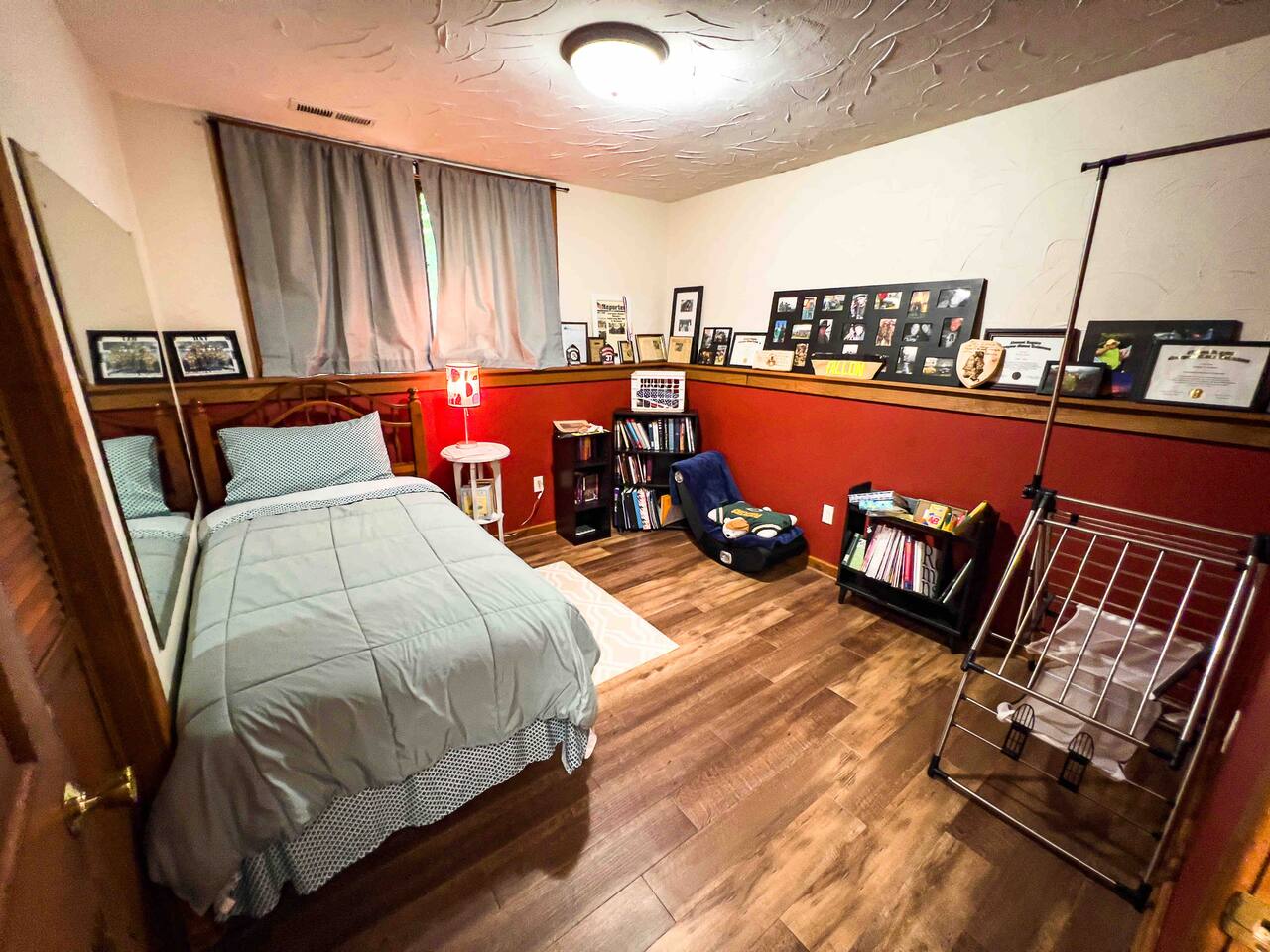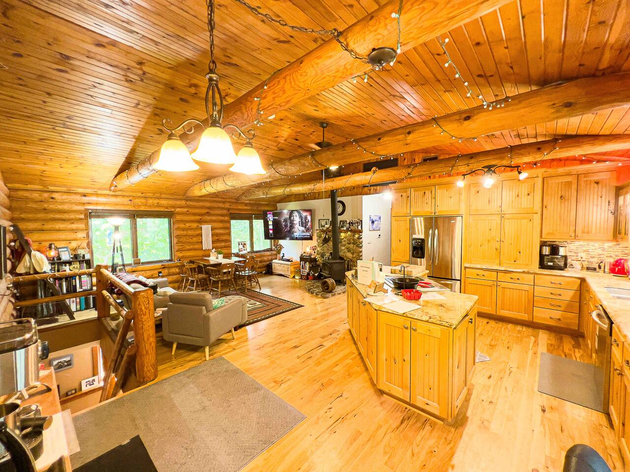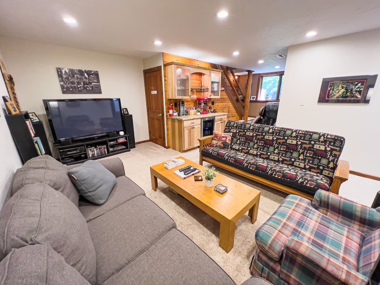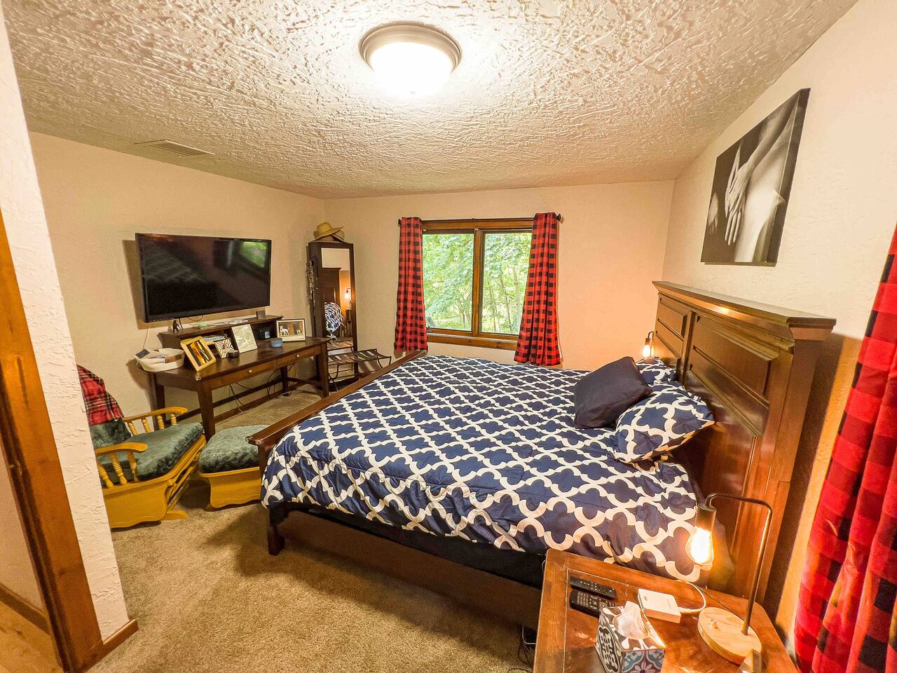 The beautiful kitchen is fully equipped with everything needed to cook for a party of 6 or a small romantic meal. For your convenience, some basic ingredients and spices are provided. Cozy up to the cobblestone fireplace indoors or keep warm at the fireplace outdoors on the picturesque deck complete with patio furniture, grill & outdoor lighting. The deck is the perfect place to spend the day relaxing, visiting, or simply enjoying the brilliance of Southeast Wiscsonsin's starry sky. Wildlife sightings from the deck regularly include deer, turkey, fox, chipmunks, squirrels, and dozens of species of birds. If lake life is what you’re interested in, the home is located a short drive from Pewaukee Lake. Fishing, boating, water sports and more available to you. Bring your water toys and put in at the public launch. The only lake access is via the public launch or Pewaukee beach. Hidden Hideaway does not have lake access to water via piers. * Log Cabin with stunning wood work and wood beams * Upper and lower floor living rooms, bedrooms, and bathrooms. * Tv in living room 75'' * Smart TV's in 2 bedrooms and living rooms. * Futon bed in lower living room * Plenty of storage space for belongings * Kitchen with stove, oven, dishwasher, microwave, fridge, and ample counter space * Cookware and dinnerware for meal preparation * Two full bathrooms * Pewaukee boat launch 3 mins away * Private back patio with furniture for relaxing. * Gas fire pit on back patio * Propane grill Please note that our backyard features, including the gas fireplace, are stored away for winter at the end of October. These amenities are not available for winter stays.